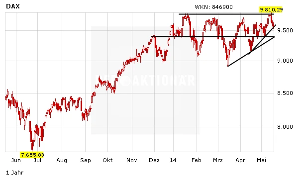 Trotz der derzeitigen Tagesverluste schellen aus charttechnischer Sicht beim DAX keineswegs bereits die Alarmglocken. Zwar rutschte der deutsche Leitindex zuletzt unter den seit Mitte April dieses Jahres ausgebildeten Aufwärtstrend, der weitaus bedeutendere März-Aufwärtstrend ist aber nach wie vor intakt. Knapp darunter verlaufen außerdem wichtige horizontale Unterstützungen bei 9.400 Punkten und bei 9.367 Zählern. Anleger bleiben in dem vom AKTIONÄR empfohlenen Mini-Long mit der WKN DZP 8FV investiert und sichern die Position knapp unterhalb der angesprochenen Supportmarken bei 9.350 Zählern oder 6,76 Euro ab.
