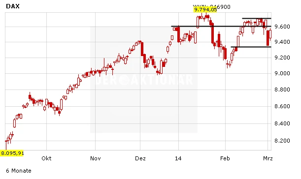 Der DAX hat sich am Dienstag nach kräftigen Vortagesverlusten wieder erholt. Äußerungen vom russischen Präsidenten Wladimir Putin sorgten an den internationalen Börsen für ein deutliches Aufatmen. Der deutsche Leitindex gewann am Nachmittag 2,19 Prozent auf 9.563,50 Punkte und baute sein Plus vom Morgen damit aus. Zum Wochenauftakt hatte die Krim-Krise einen Kursrutsch ausgelöst und den Leitindex um fast dreieinhalb Prozent ins Minus gedrückt.