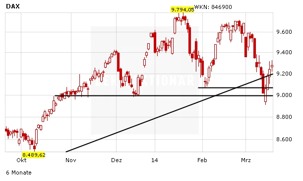 Sollten sich die Gewinnmitnahmen von gestern fortsetzen, wartet bei 9.071 Punkten die nächste Unterstützung. Wichtiger erscheint jedoch, dass die 9.000-Punkte-Marke verteidigt werden kann. Wer der Empfehlung des AKTIONÄR gefolgt ist und eine Position im DAX Turbo-Long mit der WKN DZP 26T aufgebaut hat, sollte den Stoppkurs bei 7,34 Euro beachten.