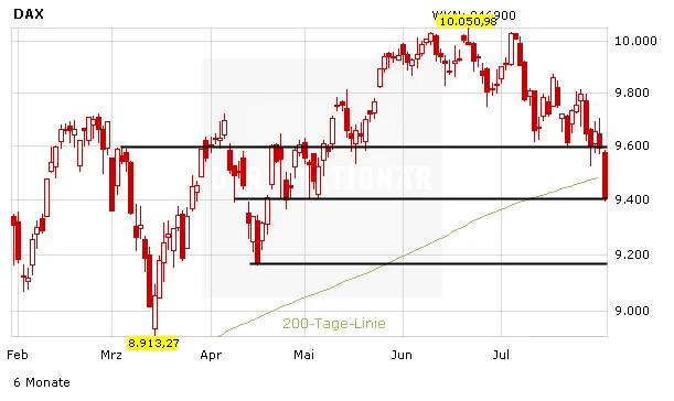 Enttäuschende Unternehmenszahlen und fortwährende Sorgen um Krisenländer haben den deutschen Aktienmarkt am Donnerstag kräftig belastet. Zeitweise fiel der Dax unter die Marke von 9.400 Punkten, die er zuletzt im April unterschritten hatte. Die wichtige 200-Tage-Linie konnte erst einmal nicht verteidigt werden.