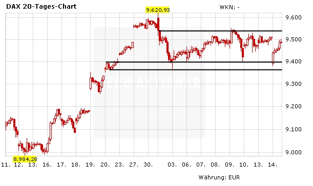 Nach der schwachen Handelseröffnung und dem kurzzeitigen Bruch der Unterstützung bei 9.400 Punkten hat sich das Bild im DAX-Chart wieder deutlich gebessert. Mittlerweile wurde sogar das heute zur Eröffnung aufgerissene Gap geschlossen. Entscheidend für den weiteren Verlauf ist, dass die Marke von 9.542 Punkten überwunden wird. Anschließend wäre das bisherige Allzeithoch bei 9.621 Zählern die letzte Hürde auf dem Weg in Richtung 10.000.