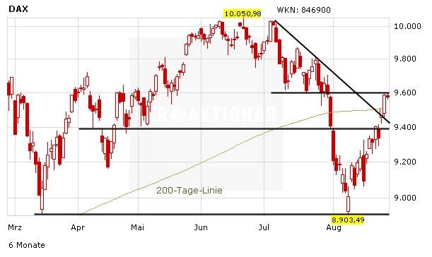 Der DAX hat nach der steilen Klettertour in den vergangenen Tagen am Mittwoch eine Ruhepause eingelegt. Gegen Mittag notiert der deutsche Leitindex 0,13 Prozent tiefer bei 9.575,36 Punkten. Seit dem Jahrestief von Anfang August bei 8.903,49 Zählern hat der DAX mittlerweile wieder mehr als sieben Prozent an Boden gut gemacht. Dabei hat er nicht nur den seit Anfang Juli ausgebildeten kurzfristigen Abwärtstrend nach oben durchbrochen, sondern auch die stark beachtete 200-Tage-Linie zurückerobert.