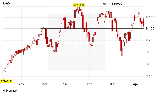 Das Zwischenhoch im DAX bei 9.720 Punkten wurde nur temporär, aber nicht nachhaltig überwunden, damit könnte sich ein Dreifach-Top herausbilden. Wird die horizontale Unterstützung bei 9.400 Punkten gebrochen, droht ein weiterer massiver Kursrutsch bis zur 9.000-Punkte-Marke. Anleger warten derzeit ein klares Signal ab.