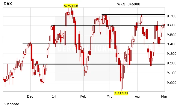 Der DAX notiert knapp oberhalb des Widerstands bei rund 9.600 Punkten. Erst wenn der Ausbruch über diese Marke nachhaltig gelingt, wird neues Kurspotenzial freigesetzt. Hinzu kommt die weiterhin angespannte Lage in der Ukraine. Anleger warten deshalb vorerst noch ab.