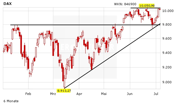 Der DAX pirscht sich nun langsam aber sicher an sein bei 10.050,98 Punkten markiertes Allzeithoch an. Ein Sprung darüber würde ein klares Kaufsignal generieren. Anleger können den Ausbruch beispielsweise mit dem Turbo-Long mit der WKN DZW 2M9 antizipieren.