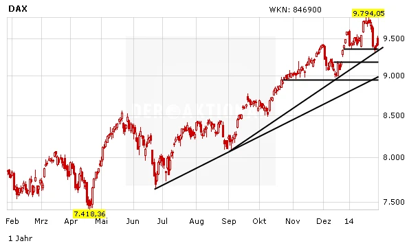 Die DAX-Entwicklung des heutigen Tages dürfte ganz im Zeichen der Notebanksitzung am Abend stehen. Diese dürfte kurzfristig die Richtung vorgeben. Der DAX hat im Tagesverlauf seine anfänglichen Tagesgewinne nahezu komplett abgegeben. Nun rückt der kurzfristige Aufwärtstrend wieder in den Fokus. Wird dieser durchbrochen, dürfte zumindest das Gap vom Dezember vergangenen Jahres bei 9.191 Zählern geschlossen werden. Ein weiteres Restrückschlagsrisiko besteht bis knapp 9.000 Zählern, wo auch der mittelfristige Aufwärtstrend verläuft. Anleger positionieren sich in dem Bereich mit einem Abstauberlimit beim Turbo-Long auf den DAX mit der WKN CT8 UMH.