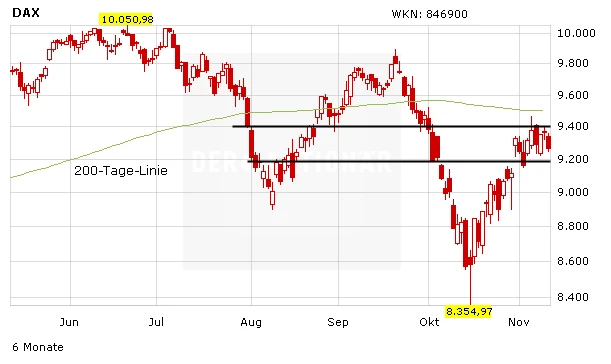 Von Konjunkturseite gab es am Mittwochmorgen auch keine neuen Hiobsbotschaften, sodass ein Blick auf die Charttechnik bleibt. Anscheinend haben einige große Anleger, nachdem der DAX den Widerstand bei 9.400 Punkten nicht überwinden konnte, erst einmal Gewinne mitgenommen. Im Zuge dessen hat der deutsche Leitindex die 55-Tage-Linie bei 9.315 Zählern durchbrochen und damit ein weiteres Verkaufssignal generiert.