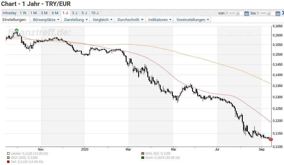 Die Türkische Lira sackt immer weiter ab. Allein seit Jahresanfang hat sie etwa 20 Prozent an Wert verloren. Am Montag gibt es für eine Lira nur noch gut 11 Euro-Cent für die Türkei-Währung. Andersherum bekommt man für einen Euro nun fast 8,90 Lira - ein neuer Rekord.
