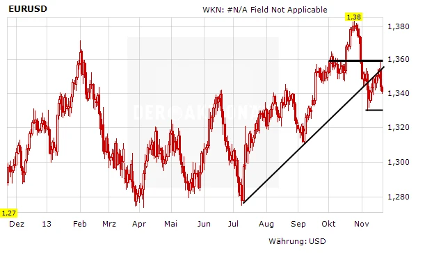 Auf die Nachricht reagierte der Euro gegenüber dem Dollar mit deutlichen Verlusten. Nachdem der Kurs an dem Widerstand bei 1,36 Dollar abprallte, notiert der Euro aktuell knapp über der 1,34-Dollar-Marke. Fällt der Kurs unter das alte Bewegungstief bei 1,33 Dollar, dürfte sich die Abwärtsdynamik weiter beschleunigen.