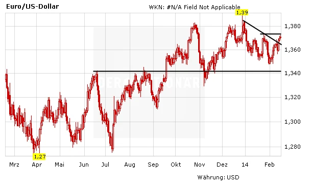 Die Gemeinschaftswährung profitierte von etwas besser als erwartet ausgefallenen Wachstumsdaten. Die deutsche Wirtschaft ist Ende 2013 stärker als erwartet gewachsen. Im vierten Quartal ist das Bruttoinlandsprodukt (BIP) der größten europäischen Volkswirtschaft um 0,4 Prozent zum Vorquartal gestiegen, so das Statistische Bundesamt am Freitag nach einer ersten offiziellen Schätzung. Volkswirte rechneten nur mit einem Zuwachs von 0,3 Prozent. Auch die italienische Regierungskrise beeindruckte Anleger in der vergangenen Woche kaum.