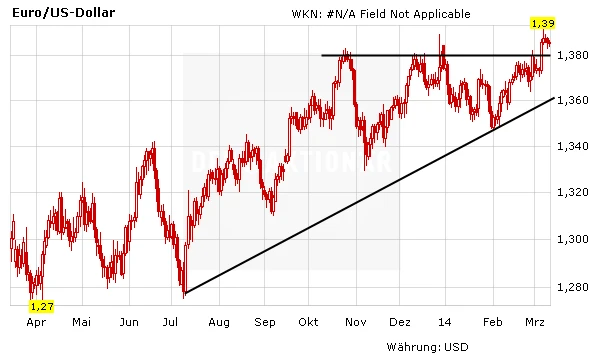 Die Euro-Notierung reagierte am Mittwoch im Handelsverlauf kaum auf die neuesten Konjunkturdaten. Die Verschnaufpause nach dem Ausbruch über die Kursmarke von 1,38 Dollar ist jedoch alles andere als ungesund. Anleger, die der Long-Empfehlung (WKN CZ0 E2S/Kaufkurs: 9,78 Euro) des AKTIONÄR gefolgt sind, bleiben investiert. Auch für einen Neueinstieg ist es noch nicht zu spät. Sobald der Ausbruch über die 1,39-Dollar-Marke gelingt, sollten Anschlussgewinne folgen.