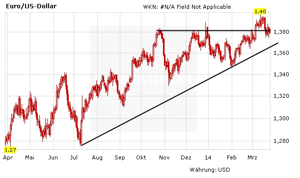 Der Kurs der europäischen Leitwährung notiert weiterhin an der horizontalen Unterstützung bei 1,38 US-Dollar. Aus charttechnischer Sicht könnte sich die Notierung nach dem jüngsten Kursrutsch stabilisieren. Anleger, die der Long-Empfehlung (WKN CZ0 E2S/Kaufkurs: 9,78 Euro) des AKTIONÄR gefolgt sind, bleiben vorerst investiert. Erst wenn der Euro auch noch unter den Widerstand im Bereich der 1,37 Dollar rutscht, drohen weitere Kursverluste.
