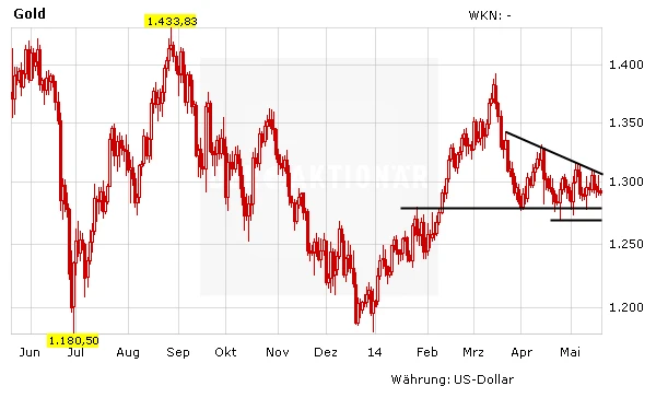Trotz des jüngsten Kursrückgangs hat sich am übergeordneten charttechnischen Bild aber nichts geändert. Der kurzfristige Abwärtstrend ist weiter intakt, ebenso auch die charttechnischen Unterstützungen bei 1.280 und 1.268 Dollar. Der folgende Ausbruch aus dieser Formation dürfte die kurzfristige Richtung vorgeben.