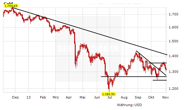 Nachdem der Goldpreis noch Anfang der vergangenen Woche nach oben auszubrechen schien, musste er im Wochenverlauf wieder deutlich Federn lassen. Die Analysten der Commerzbank erklären den Rückgang zum einen mit den Nachwirkungen der Sitzung der amerikanischen Notenbank in der vergangenen Woche. Die Statements deuteten weniger auf eine länger anhaltende Geldflut hin als gehofft. Zum anderen führte aber eine extrem niedrige Kerninflationsrate in der Eurozone - diese hatte im Oktober mit 0,8 Prozent das Rekordtief eingestellt - zu Spekulationen unter den Marktteilnehmern, dass die EZB im Dezember die Zinsen senken könnte. Beides resultiert jedoch in einem deutlich festeren Dollar, was die Edelmetallpreise letztendlich belastet.