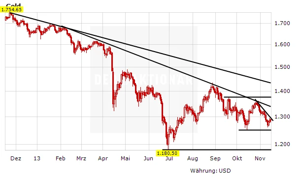 Aus charttechnischer Sicht würde ein erstes positives Signal generiert, wenn der Sprung über den kurzfristigen Abwärtstrend gelingt. Rutscht die Notierung hingegen unter die Unterstützung bei 1.252 Dollar, ist mit einem weiteren Kursrückgang bis in den Bereich der Jahrestiefstände bei 1.181 Dollar zu erwarten. Anleger sollten demnach weiter das langfristig positive Umfeld für Gold spielen und auf der Longseite mit dem Gold-Tracker mit der WKN GS0 HH0 engagiert bleiben. Sollte jedoch Gold unter 1.252 Dollar abrutschen, können risikobereite Investoren mit dem Turbo-Put mit der WKN UA2 4V5 kurzfristig auf fallende Kurse setzen.