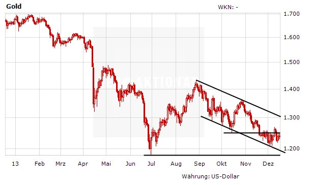 In der laufenden Woche hat der Goldpreis einen erneuten Versuch gestartet, die Hürde bei 1.252 Dollar zu überwinden. Bislang erwies sich der Widerstand aber also zu groß. Seitdem befindet sich das Edelmetall wieder im Rückwärtsgang. Derzeit kostet eine Feinunze 1.233,25 Dollar und damit 0,6 Prozent weniger als am Vortag.