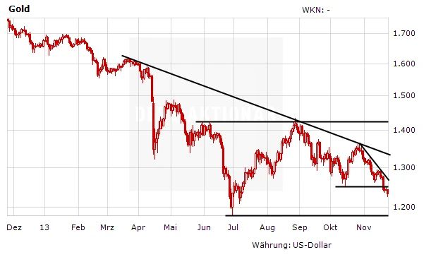 Grund für den jüngsten Rückgang sind Spekulationen über eine baldige Straffung der US-Geldpolitik. Einige Marktteilnehmer erwarten, dass die US-Notenbank Fed bereits im Dezember oder Januar ihre milliardenschweren Wertpapierkäufe drosseln könnte. Auf die Laune der Anleger drückte außerdem die Einschätzung von Goldman Sachs, die in ihrer jüngsten Studie für 2014 einen Preisrückgang von mindestens 15 Prozent erwartet.