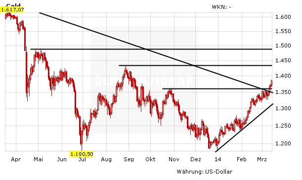 Zuletzt gelang es dem Goldpreis, gleich mehrere Widerstände aus dem Weg zu räumen. Zum einen durchbrach die Notierung das Oktoberhoch 2013 bei 1.362 Dollar, zum anderen den seit Ende 2012 ausgebildeten Abwärtstrend. Nun dürfte der Goldpreis direkt in Richtung des Augusthochs 2013 bei 1.434 Dollar laufen. Unterstützung erhält das Edelmetall vom kurzfristigen Aufwärtstrend sowie der 200-Tage-Linie, die derzeit bei gut 1.300 Dollar verläuft.
