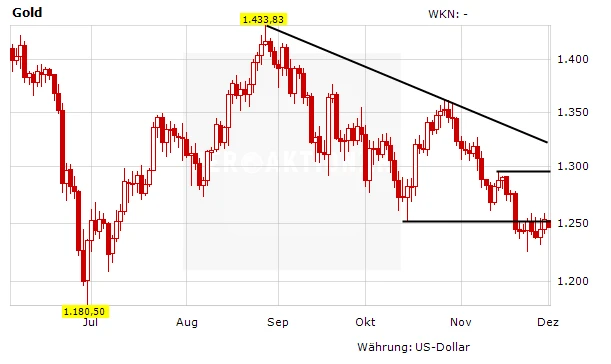 Seitdem pendelt die Feinunze in einer engen Range zwischen 1.228 und 1.258 Dollar. Solange dieser Bereich nicht verlassen wird, dürften sich auch die Anleger mit neuen Positionen zurückhalten. Ein positives Signal wäre ein Überwinden der Marke von 1.300 Dollar. Dann gäbe es zumindest aus charttechnischer Sicht die Hoffnung, dass Gold wieder an das Augusthoch bei 1.433 Dollar heranläuft.