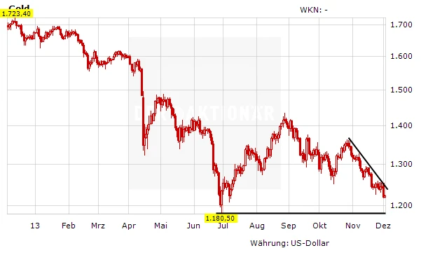 Grund für den erneuten Einbruch beim Goldpreis waren starke Konjunkturdaten aus den USA. Der ISM-Einkaufsmanagerindex für die Industrie stieg im November überraschend auf den höchsten Stand seit April 2011. Durch die Zahlen wird eine rasche Drosselung der milliardenschweren Anleihekäufe wahrscheinlicher, mit denen die US-Notenbank Fed die Wirtschaft stützt.