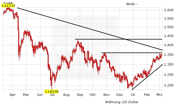 Auch wenn der Goldpreis zum Wochenschluss noch eine kleine Delle erfahren hat, drängt er seit dem Jahresanfang massiv nach oben. Mittlerweile notiert das Edelmetall rund zehn Prozent im Plus. Und dieser Trend könnte durchaus noch weiter anhalten. Ein klares positives Signal war der Sprung über die 200-Tage-Linie. Nun gilt es, den Kreuzwiderstand im Bereich von 1.370 Dollar nach oben zu durchbrechen. Daraus würde sich kurzfristig weiteres Potenzial bis in den Bereich von 1.434 Dollar ergeben. Ein wichtiger Support befindet sich bei etwa 1.300 Dollar, wo auch die 200-Tage-Linie verläuft.
