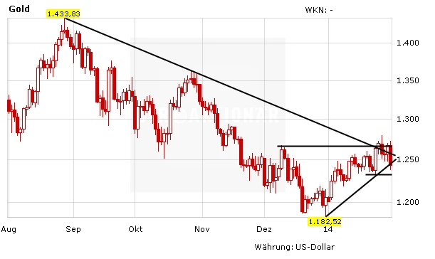 DER AKTIONÄR hatte nach dem Intraday-Bruch des Widerstands bei 1.268 Dollar mit einem Turbo-Long (WKN SG4 EL3; Kaufkurs: 21,55 Euro) auf einen weiteren Anstieg spekuliert. Für langfristig orientierte Anleger gilt ein Stoppkurs von 12,80 Euro. Trader platzieren den Stopp zwangsläufig enger.