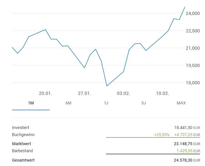Am jüngsten Höhenflug ist der Call-Optionsschein auf Nvidia maßgeblich beteiligt. Nach starken Zahlen legte die Aktie über sieben Prozent zu und schloss bei knapp 290 Dollar. Der Optionsschein hat sich seit Kauf mehr als verdoppelt.