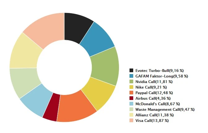 Zweitbester Wert mit einem Plus von über 60 Prozent ist der Faktor-Long auf den GAFAM Index, während der Call auf Airbus abgestürzt ist und als einzige Position im Minus notiert.