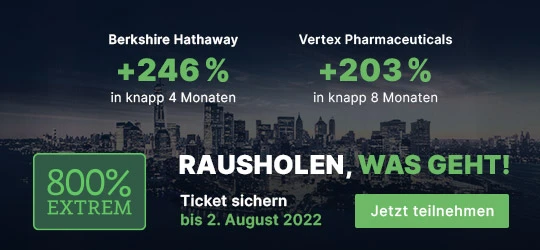 Natürlich hatten die letzten historisch schlechten Monate an der Börse auch einen Impact auf die letzte Runde von 800% EXTREM. Dennoch konnten auch hier wieder durch den cleveren Einsatz des richtigen Hebels mit Werten wie Berkshire Hathaway (+246 Prozent) oder Vertex Pharmaceuticals (+203 Prozent) in kurzer Zeit satte Renditen erzielt werden.