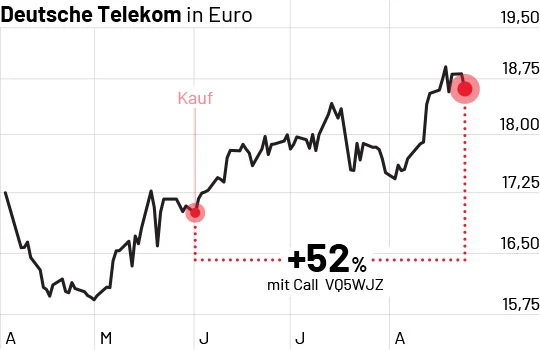 Konservative Werte werden oftmals als langweilig und behäbig abgestempelt. Doch ein Plus von 52 Prozent innerhalb weniger Wochen mit einem Optionsschein auf die Deutsche Telekom ist nichts weniger als ein großartiges Ergebnis und spiegelt eine knallharte Outperformance gegenüber dem Kurs der Aktie wider, die im selben Zeitraum nur gute 8 Prozent zugelegt hat. Doch wie ist solch eine Gewinnvervielfachung möglich? Mit einem Expertenteam und der Kraft des richtigen Hebels durch Optionsscheine im Rücken maximieren jetzt auch Sie Ihre Gewinne und zünden den Performance-Turbo.
