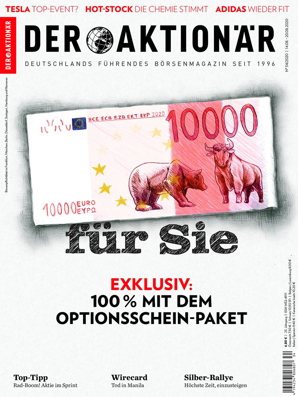 Jetzt stellt die Redaktion des führenden deutschen Anlegermagazins im Rahmen der aktuellen Titelgeschichte (hier gelangen Sie direkt zum digitalen E-Paper) zehn neue Aktien und Optionsscheine vor. Potenzial: Verdopplung. Charakter: Spekulativ. Spaßfaktor: Enorm. Im Anschluss – mit Erscheinen der nächsten Ausgabe (Nr. 35/2020) – startet die Redaktion eine fünfteilige Serie über Optionsscheine, die Sie zum Hebelprofi macht. Worauf müssen Sie bei der Wahl des richtigen Optionsscheines achten, welche Bedeutung haben die einzelnen Fachtermini? Passend zur Serie hat das Vertriebsteam ein fünfteiliges Mini-Abo mit Preisvorteil entworfen: Lesen Sie 5 digitale Ausgaben des AKTIONÄR zum Preis von nur 25,00 Euro statt regulär 34,00 Euro und sparen Sie damit über 26 Prozent gegenüber dem regulären Verkaufspreis.