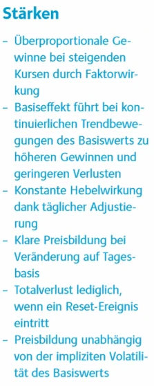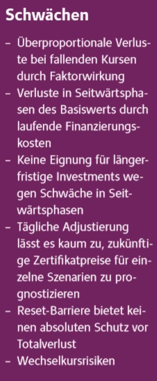 Faktor-Zertifikate zeichnen sich vor allem durch den konstanten Hebel aus. Während der Hebel bei Turbo-Optionsscheinen oder Mini-Futures bei steigenden Kursen immer kleiner wird und vice versa, ist er hier unveränderlich. Das hat allerdings zur Folge, dass die Scheine trotz der unbegrenzten Laufzeit nicht für die langfristige Anlage gedacht sind.