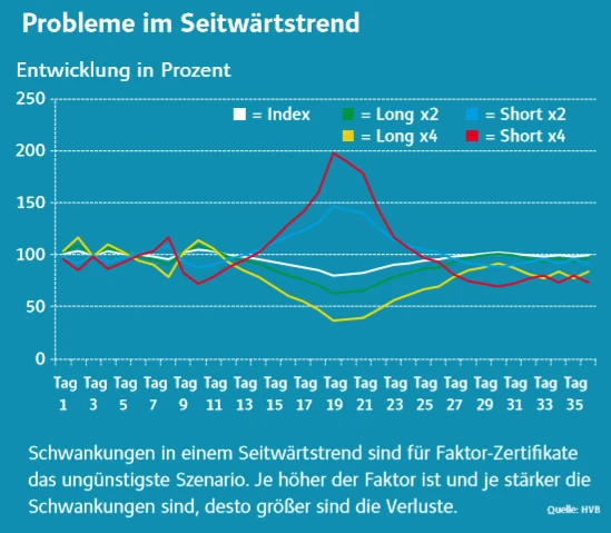 Dieses Risiko bei Seitwärtsbewegungen erklärt auch, warum Faktor-Zertifikate sich nicht unbedingt für längerfristige Investments eignen. Interessant sind sie vor allem für kurzfristig orientierte Trader.