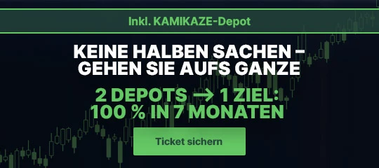 Doch damit nicht genug: Neben dem EXTREM-Depot wird zusätzlich das KAMIKAZE-Depot aufgelegt. Besonders waghalsige Anleger haben hier mit noch dynamischeren Werten und Optionsscheinen nochmals die Chance auf 100 Prozent Gewinn. Auch hier spricht die Erfolgsquote für sich: In 4 von 5 Runden sprang mit diesem explosiven Depot nach 7 Monaten ein Gewinn heraus.