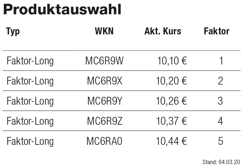 Die Lage an den Märkten wird sich wieder beruhigen. Clevere Anleger bewahren einen kühlen Kopf und setzen mit dem Recovery Index jetzt auf einen Korb aus 15 Einzelwerten mit hohem Erholungspotenzial. Je nach Anlegertyp und persönlicher Risikoneigung können Produkte mit unterschiedlichen Hebeln – das Spektrum reicht von Hebel 1 bis Hebel 5 – gekauft werden. DER AKTIONÄR favorisiert in einem Erholungsszenario ein Faktor-Zertifikat mit Hebel 3.