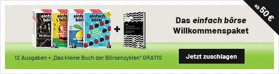 Wenn Sie regelmäßig über die aktuellen Anlagetipps und -trends informiert bleiben wollen, dann setzen Sie auf einfach börse im Abo. Damit erhalten Sie – jeden Monat neu – relevantes Basiswissen und Informationen rund um die moderne Geldanlage sowie unterhaltsame Berichte aus der Welt der Börse.