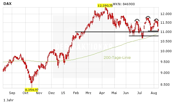 Die nächsten Unterstützungen sind nicht weit entfernt: Bei 10.901 Zählern verläuft die 200-Tage-Linie, knapp darunter - bei 10.800 - liegt eine horizontale Auffanglinie. Der letzte Support vor einem stärkeren Sell-off wäre das Julitief bei 10.652 Punkten.