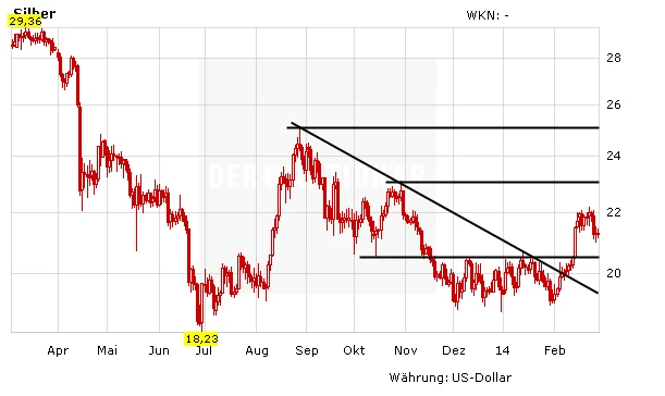 Von 100 Dollar zu sprechen ist noch etwas verfrüht. Aus charttechnischer Sicht ist die jüngste Korrektur aber kein Beinbruch – im Gegenteil. Der Silberpreis sollte jedoch nicht mehr unter das Ausbruchsniveau bei 20,50 Dollar fallen. Anleger bleiben im empfohlenen Turbo-Long mit der WKN TB4 AXF weiter mit einem Stopp bei 4,00 Euro investiert.