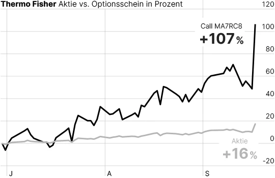 Mit mehr als 400.000 Kunden unter anderem aus der Pharma- und Biotech-Industrie zählt Thermo Fisher Scientific zu einem der weltweit führenden und einflussreichsten Partner für die Wissenschaft. Dennoch fristete die Aktie des erfolgreichen Unternehmens bislang eher ein Schattendasein abseits des großen öffentlichen Fokus. Zu Unrecht: Das Team der 800%-Strategie PLUS erkannte die Chance und setzte im Juni 2021 bei Thermo Fisher den Hebel an – mit Erfolg. In nur 3 Monaten wurde mit einem Plus von 107 Prozent eine 6,6-fache Outperformance gegenüber der Aktie erreicht. Profitieren Sie jetzt ebenfalls vom Erfolgssystem der 800%-Strategie PLUS.