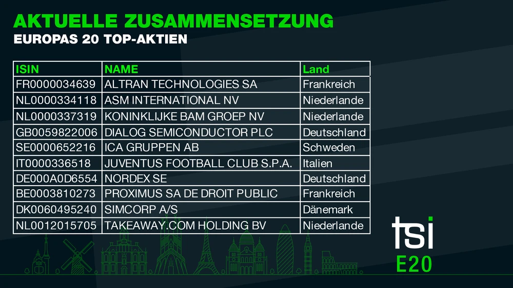 TSI E20: Warum ein solcher Index? Der Fokus der meisten Anleger hierzulande ist naturgemäß auf deutsche Aktien gerichtet. Eventuell kommen noch einige US-Werte hinzu. Doch auch viele unserer europäischen Nachbarn besitzen stabile Volkswirtschaften und aussichtsreiche Unternehmen, die nicht selten ihren deutschen Pendants den Rang ablaufen. Auf solche Aktien hinzuweisen und sie bequem investierbar zu machen ist das Ziel des E20-Index.