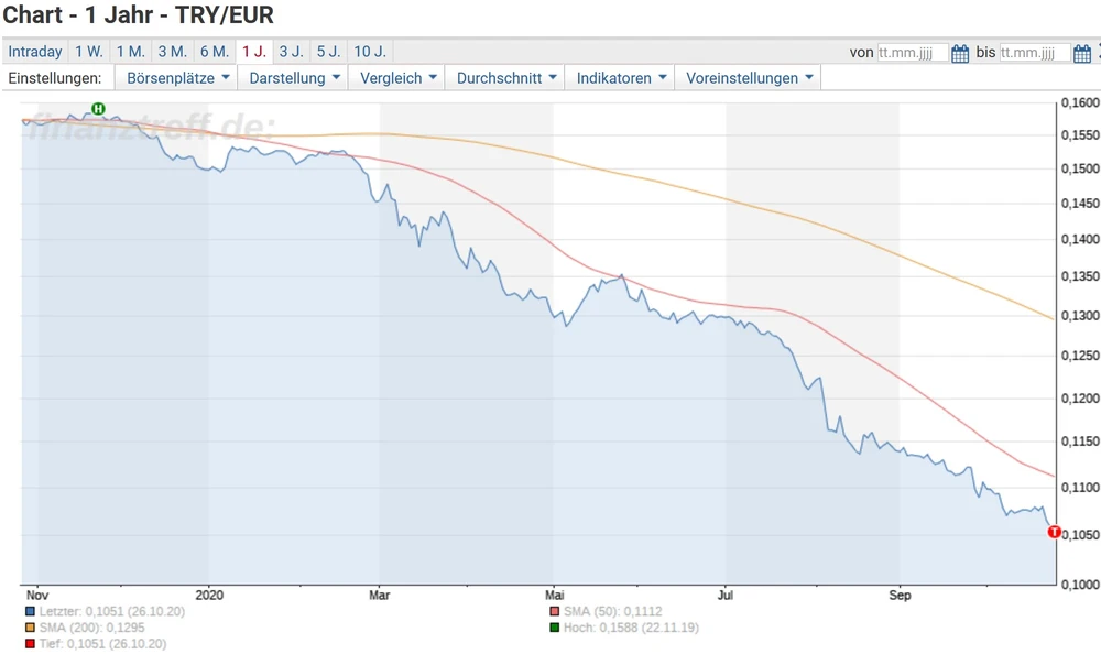 Als Gründe gelten erneute Kämpfe in der Region Berg-Karabach, die einen neuen Waffenstillstand zu stören drohen. Auch die Spannungen zwischen Ankara und Athen über ein umstrittenes Gebiet im östlichen Mittelmeerraum lasten auf der Türkei-Währung.