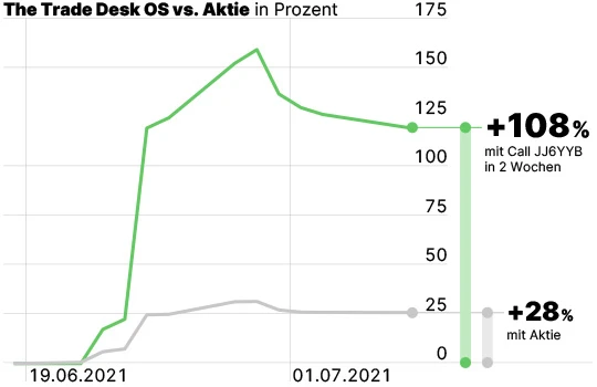 Auch die letzte Runde hat gezeigt: Erfolg ist zwar nicht planbar, wird aber unter Zugabe von Expertenwissen und einer Top-Strategie wahrscheinlich. Beispiel gefällig? Bereits frühzeitig erkannten die Experten von 800% EXTREM das Potenzial des amerikanischen Tech-Unternehmens The Trade Desk im boomenden Onlinemarketing-Geschäft. Hintergrund: The Trade Desk hat eine KI-gestützte Softwareplattform programmiert, die es Werbetreibenden erlaubt, ihre Anzeigen automatisiert auf dem am besten geeigneten Werbeplatz zu einem möglichst günstigen Preis platzieren zu lassen. Mit dem idealen Optionsschein setzte das Team auf steigende Kurse.