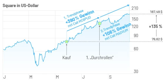 Waren der ausgewählte Basiswert und der dazu passend ausgesuchte Optionsschein Treffer, sind oft Renditen von mehreren 100 Prozent möglich. Durch einen weiteren Kniff lassen sich diese sogar noch steigern. Möglich macht dies das sogenannte Durchrollen: Intakte Trends erlauben es, gut gelaufene Optionsscheine mit Gewinn zu verkaufen und aus den Verkaufserlösen einen neuen Schein auf denselben Basiswert zu kaufen – das erlaubt konstant hohe Hebel, die andernfalls nachlassen würden, je weiter ein Schein ins Geld läuft. In starken Börsenphasen ist ein solches Durchrollen zwei bis drei Mal pro Jahr möglich – das sorgt in einzelnen Positionen immer wieder für Traumrenditen von 1.000 Prozent und mehr.