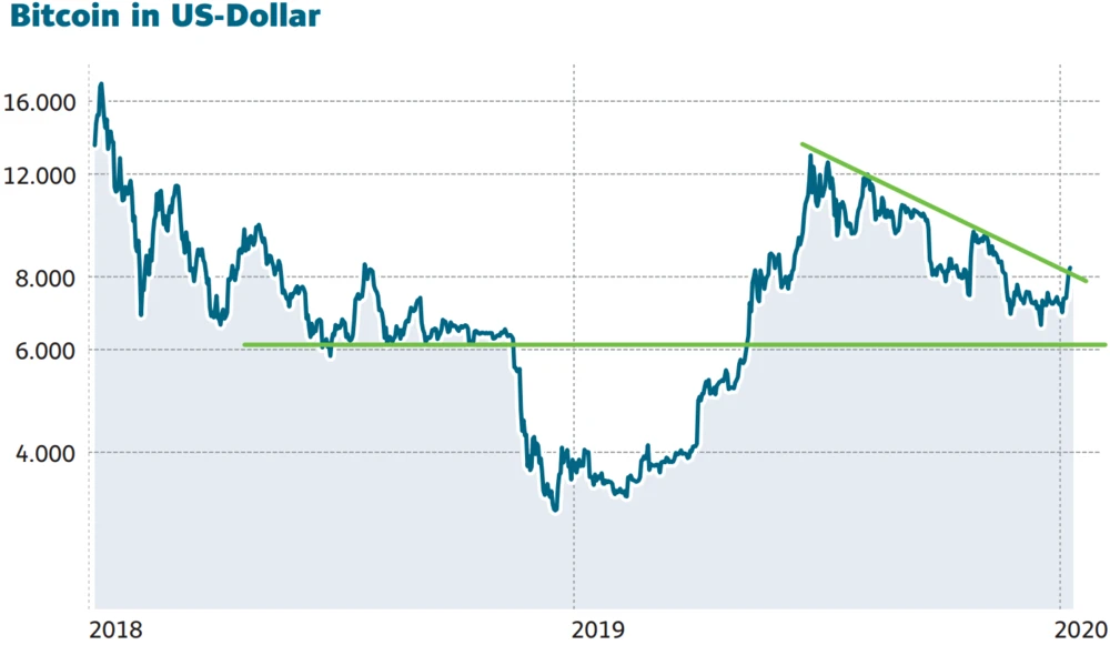 Egal ob nun der Iran-Konflikt hinter der jüngsten Kursbelebung steckt oder nicht: Der Bitcoin hat am Dienstag die Marke von 8.000 Dollar und erstmals seit November 2019 auch die 200-Tage-Linie hinter sich gelassen. Zudem ist der Ausbruch aus dem mittelfristigen Abwärtstrend seit Ende Juni gelungen.