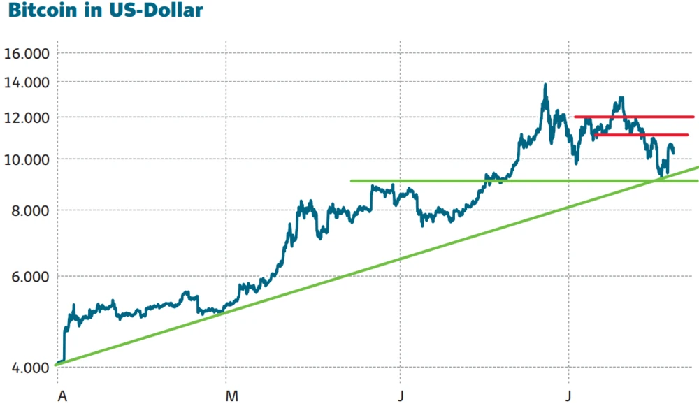 Durch den jüngsten Kurssprung hat sich die charttechnische Lage wieder aufgehellt. Der seit Anfang April gültige Aufwärtstrend ist intakt. Im Bereich von rund 11.100 und 12.000 Dollar warten allerdings zwei weitere Widerstände, die es auf dem Weg zurück nach oben zu knacken gilt.