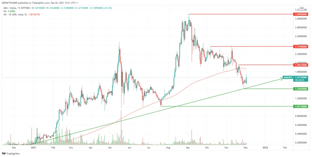 Anfang September markierte ADA noch ein frisches Allzeithoch bei 3,10 Dollar. Im Anschluss weiteten sich die Gewinnmitnahmen immer stärker aus und auch die wichtige 200-Tage-Line bei 1,87 Dollar konnte den Abverkauf nicht aufhalten. Ende November fiel der Kurs sogar auf ein Mehrmonatstief bei 1,42 Dollar.