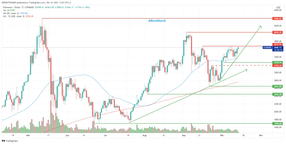 Der Kurs von Ether (ETH) zieht seit vier Wochen wieder kräftig an und hat in dieser Zeit über 35 Prozent zugelegt. Nun notiert der Preis vor einer wichtigen Marke, dem Widerstand bei 3.675 Dollar. Dieses Level ist entscheidend, da beim Überschreiten ein starkes technisches Kaufsignal ausgelöst wird.