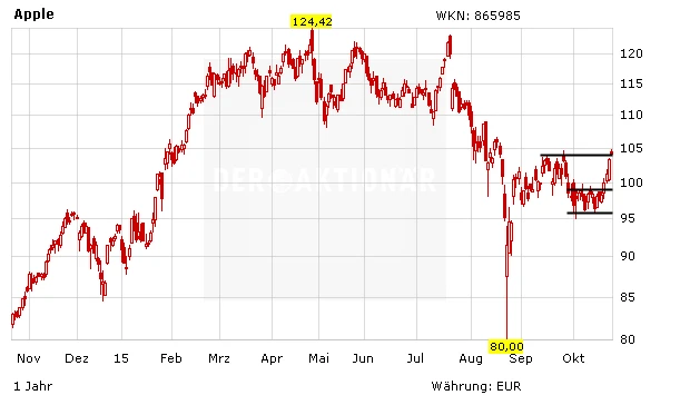 Das Chartbild der Apple-Aktie hellt sich immer weiter auf. Nachdem den Widerstand bei 111 Dollar überwunden wurde, ging es für den Titel am Donnerstag weiter nach oben. Aktuell kämpft das Papier um die Marke bei 116 Dollar. Sollte ein nachhaltiger Ausbruch darüber gelingen, können neben Tradern auch Anleger erste Positionen aufbauen. Die Aktie ist mit einem 2015er-KGV von 12 günstig bewertet.