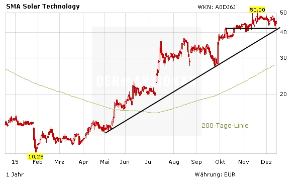 Seit Jahresbeginn legte die Aktie um 189 Prozent zu und ist zweitbester TecDax-Wert. Mit einem Kurszuwachs von 108 Prozent sind die Nordex-Papiere auf Platz fünf zu finden. Gut möglich also, dass es sich bei den heutigen Kursgewinnen auch um Windowdressing handelt. Aus Sicht des AKTIONÄR spricht trotz der Wertentwicklung im laufenden Jahr angesichts eines 2016er-KGVs von 17 und der charttechnischen Verfassung der Aktie nichts gegen einen Neueinstieg. Nicht nur der Aufwärtstrend ist voll intakt, sondern das Papier drehte auch mustergültig an der Unterstützung bei 42,29 Euro wieder nach oben.