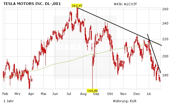 Die Tesla-Aktie ist im letzten Monat unter die Räder gekommen. Seit dem Zwischenhoch Ende Dezember büßte das Papier satte 25 Prozent an Wert ein. Auch am gestrigen Mittwoch ging es nach unten. Zum Handelsschluss stand ein Minus von fast drei Prozent zu Buche. Die neuen China-Hoffnungen zu Beginn der Woche haben der Aktie keinen Aufschwung gegeben.